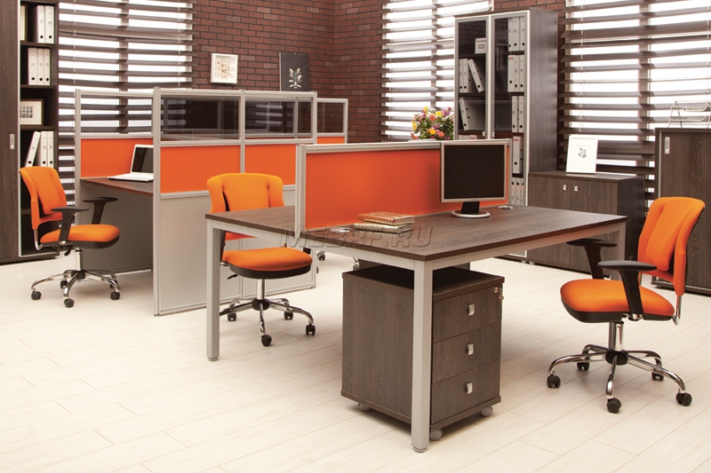 КРАТКОЕ ОПИСАНИЕ: Столы, брифинги, крышки тумб изготовлены из ЛДСП  толщиной 38 мм.  Облицованы противоударной кромкой ПВХ 2 мм. Полки шкафов из ЛДСП  толщиной 25 мм, облицованы кромкой ПВХ 0,4 мм. Остальные элементы изготовлены   из ЛДСП толщиной 16 мм и облицованы кромкой ПВХ 0,4 мм. Стекло тонированное или тонированное в алюминиевом профиле. Фурнитура  производства фирмы Hettich (Германия).